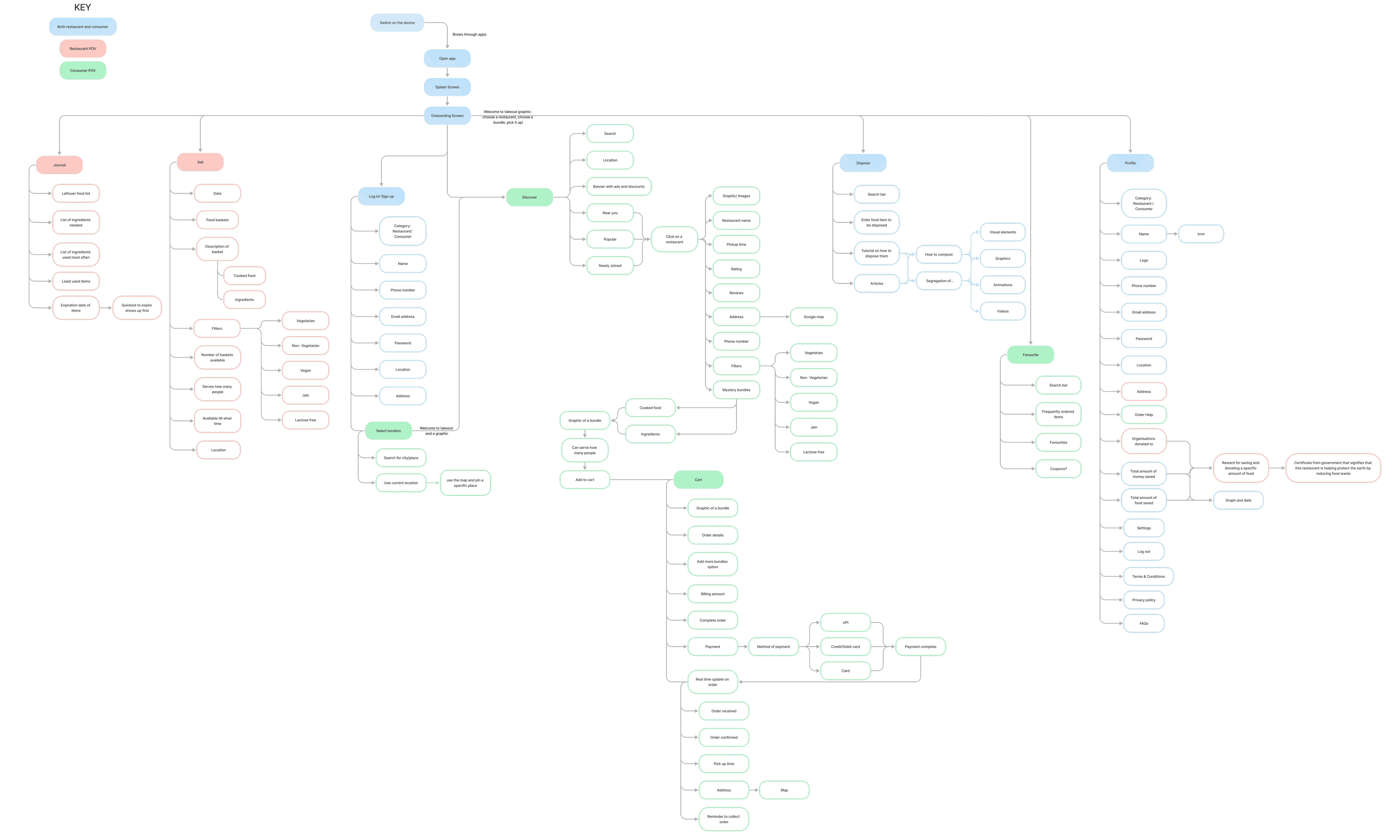 This flow shows how users can select and pick up mystery food bags from nearby hotels through the app. They can filter options based on location, dietary preferences, and pick-up times, favorite restaurants, learn how to compost food at home, view past orders, and chat with an AI bot for any queries.