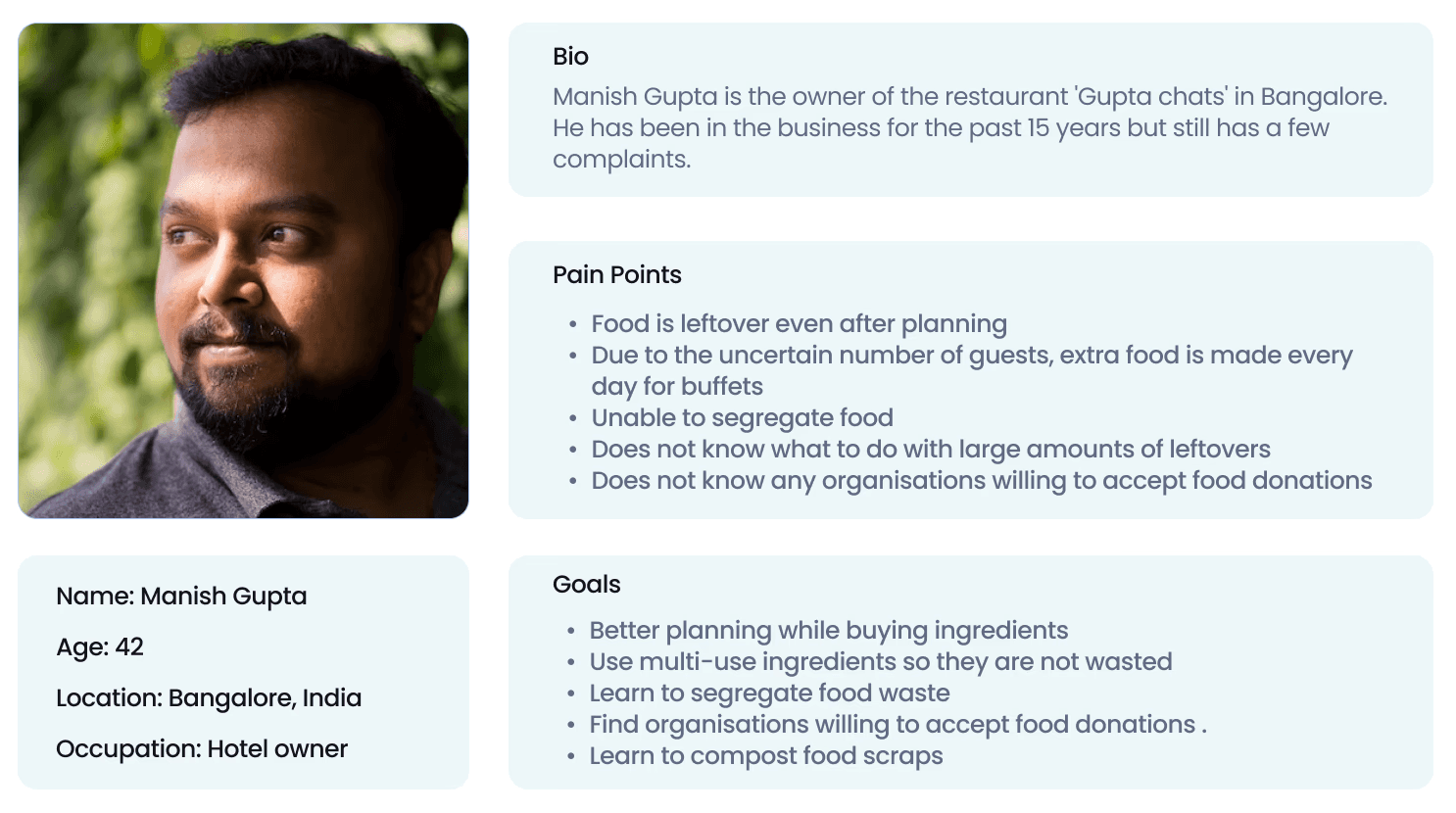 Meet Manish, a hotel owner in Bangalore, India, struggling with large amounts of leftover food at the end of each workday, always seeking better planning strategies to reduce waste and handle leftovers more effectively.