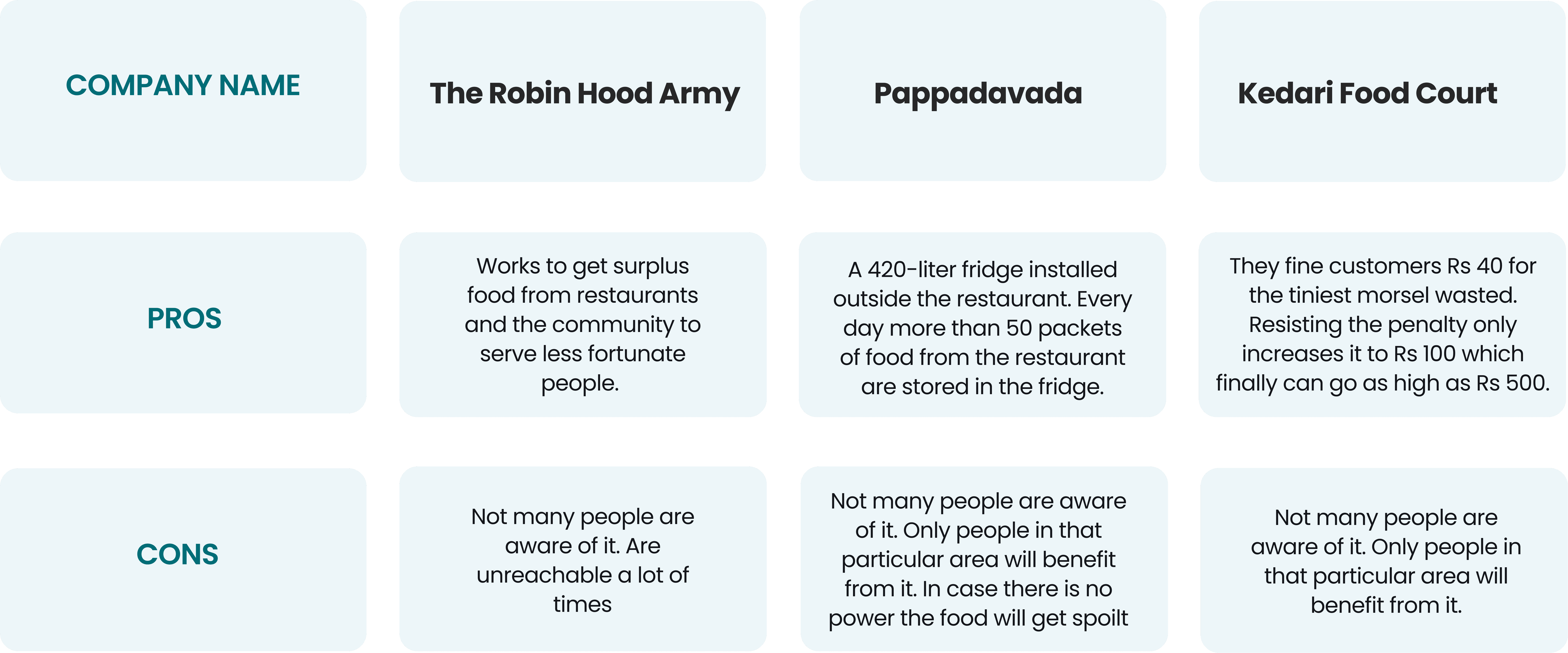 No food donation system exists due to safety concerns (uncertain preparation/storage times).